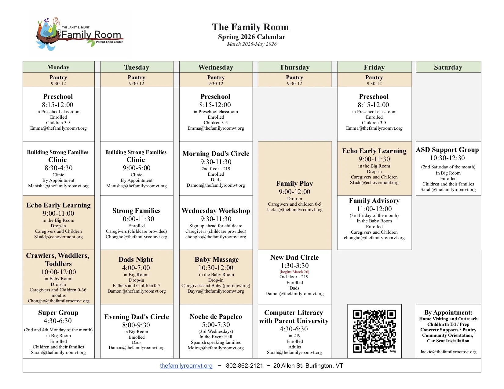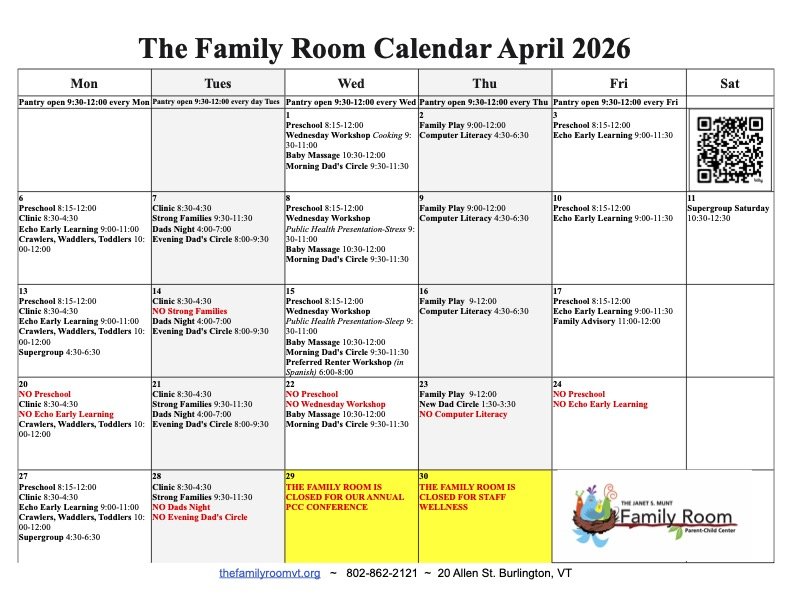 All of The Family Room programs are low barrier and available at no cost to families. Many of our programs are drop-in and you are free to come and bring your children who meet the age requirements. Some programs need enrollment. You can reach out to us to learn more using the email listed for the program you are interested in.